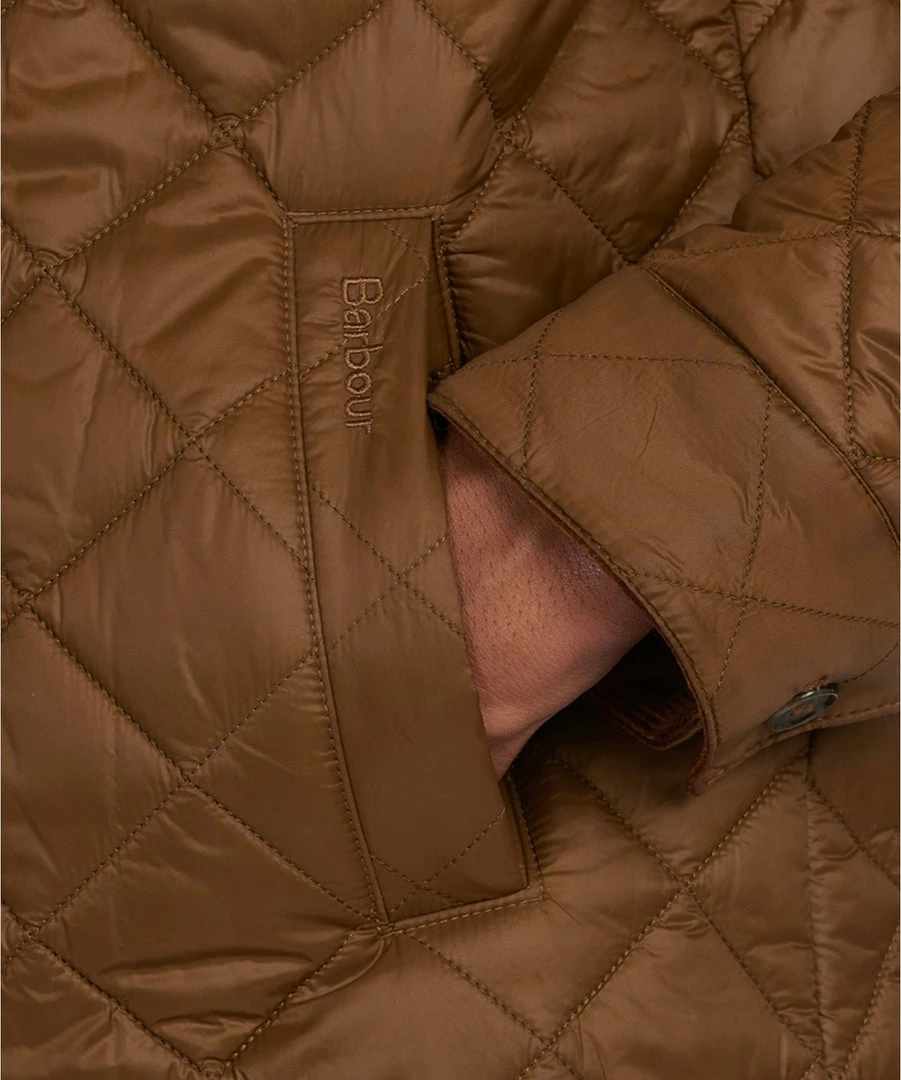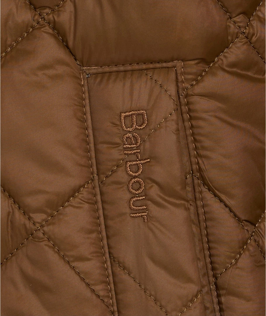 - Box-quilted design; corduroy trim at interior collar; adjustable button cuffs; adjustable hem; embroidered logo at left pocket; tartan lining; lightweight