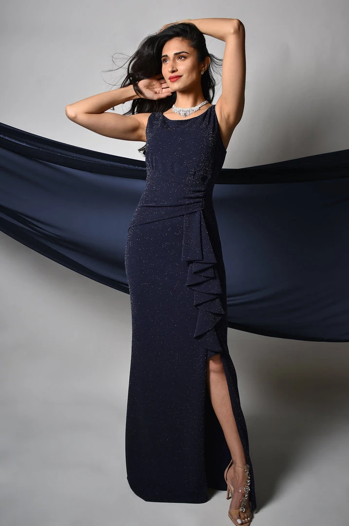 Midnight side slit gown with gathering at the waist and a cascading ruffle.