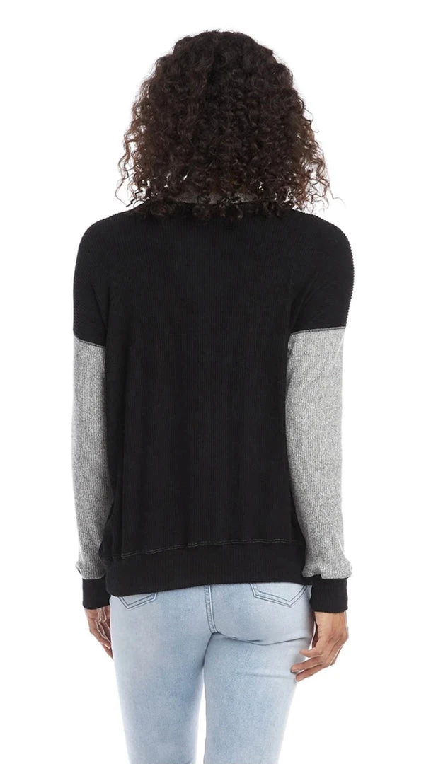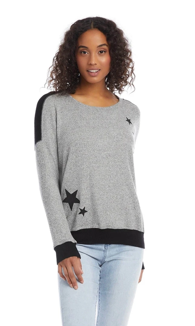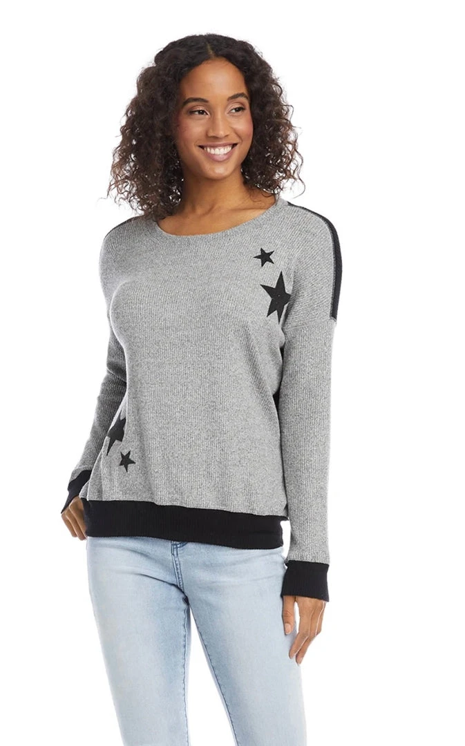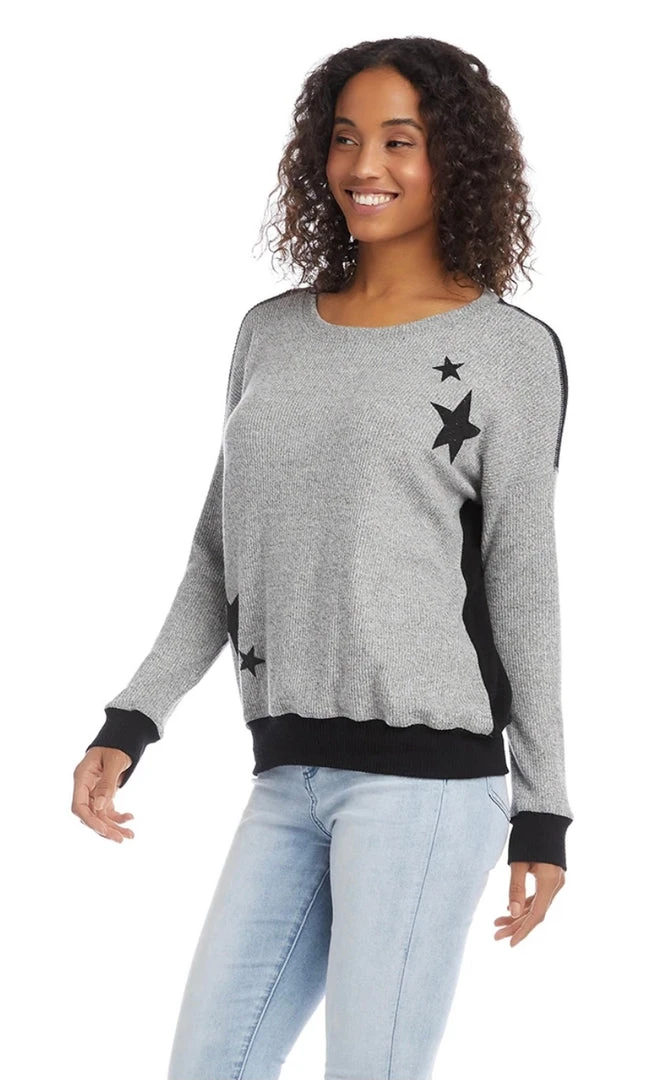 - Ultra-soft brushed rib knit shapes this colorblock top. Subtly shimmering stars add a fresh twist. Its subtle contrast cuff and hem make this top perfect for endless layering options.