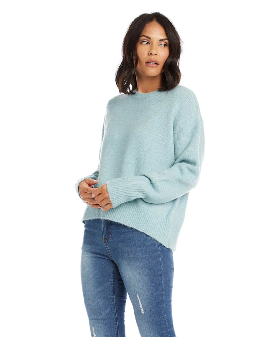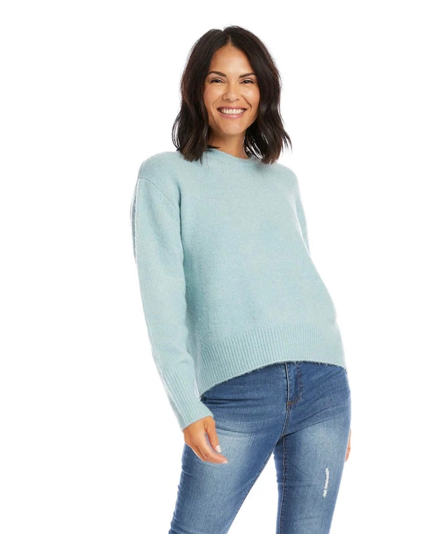 With its fuzzy knit construction and roomy fit, this sweater is a layering essential for the cooler temperatures ahead. It’s finished with a stylish hi-lo hem.
