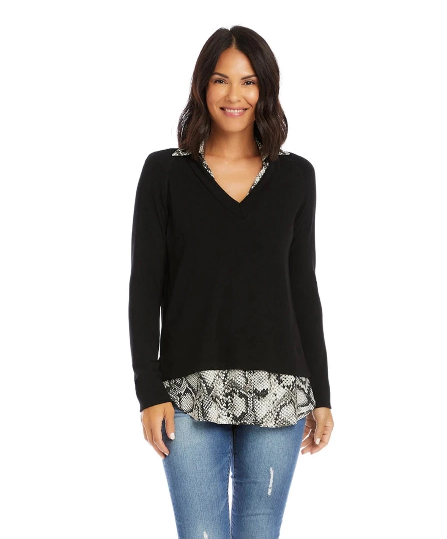 - A monochromatic snake print hem and collar bring a stylish layered illusion to this soft pullover sweater. This layered sweater is perfect for the office.