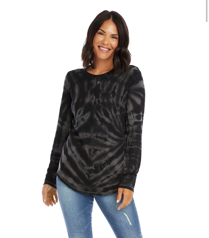 A painterly abstract pattern shapes this fitted knit top detailed with an edgy raw hem. -