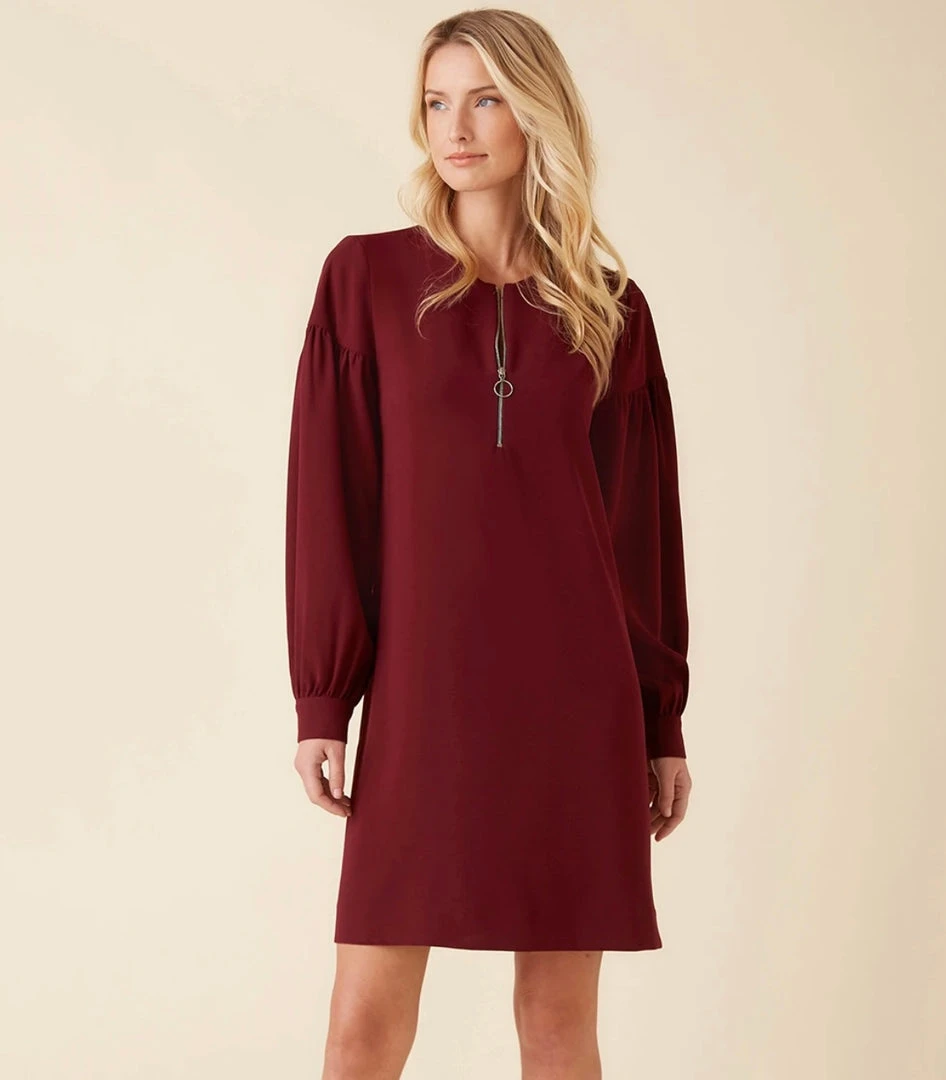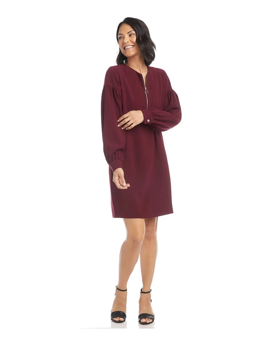 - Sleek and modern, satin back crepe shapes this sophisticated shift dress detailed with statement-making puff sleeves. An exposed zipper at the neckline adds a dash of edge.