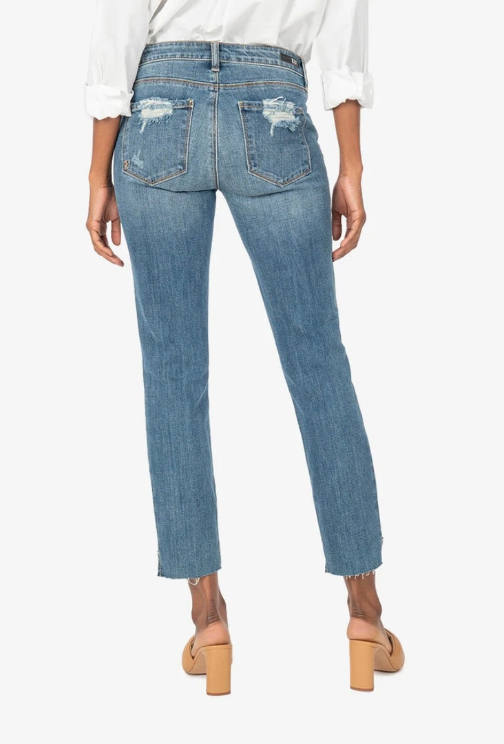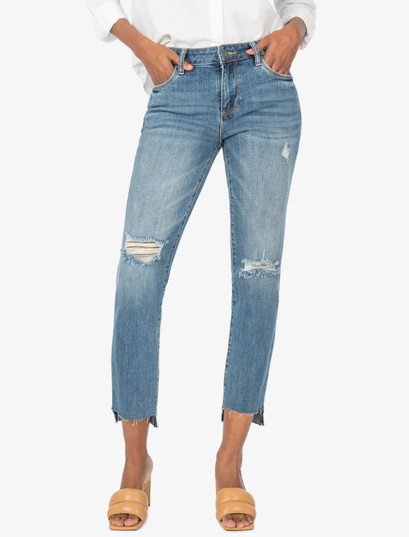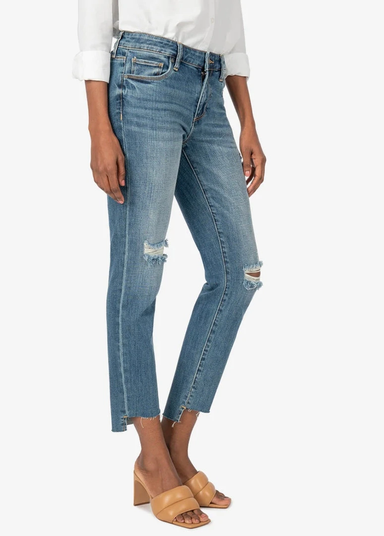 - Cool, casual straight-leg jeans with edgy rips and frayed hems are cut from soft, stretch to comfort denim.