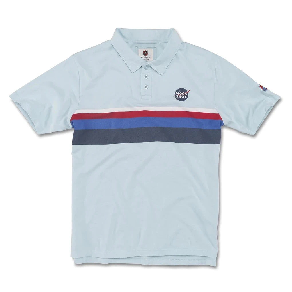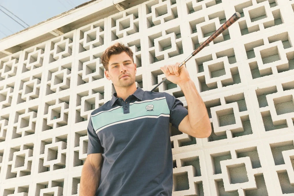 Men’s short sleeve 100% cotton polo tee. Soft vintage hand feel with printed retro stripes and logo. Left sleeve has soft cotton yarn 19th Hole logo embroidery detail. Matte finish buttons match polo body color.
