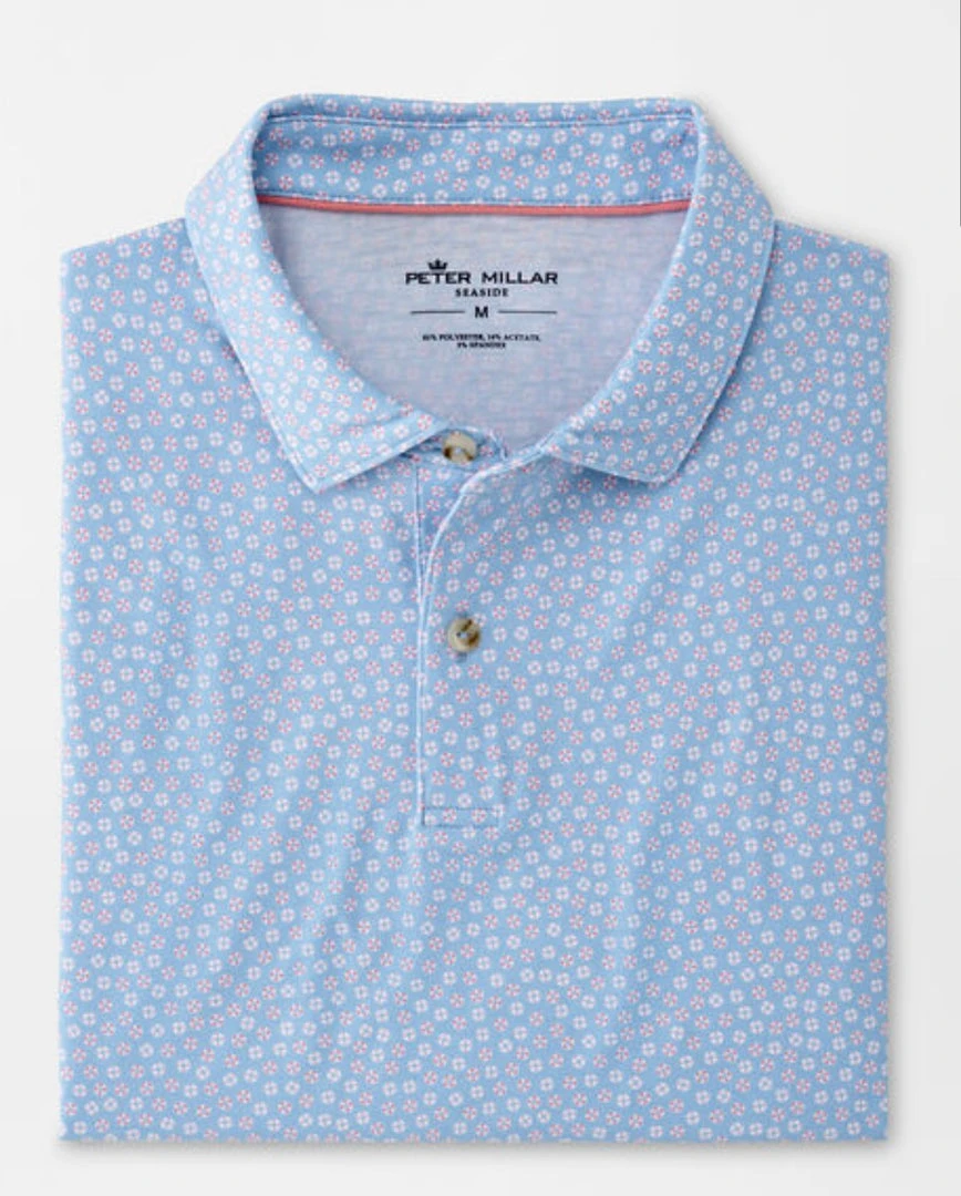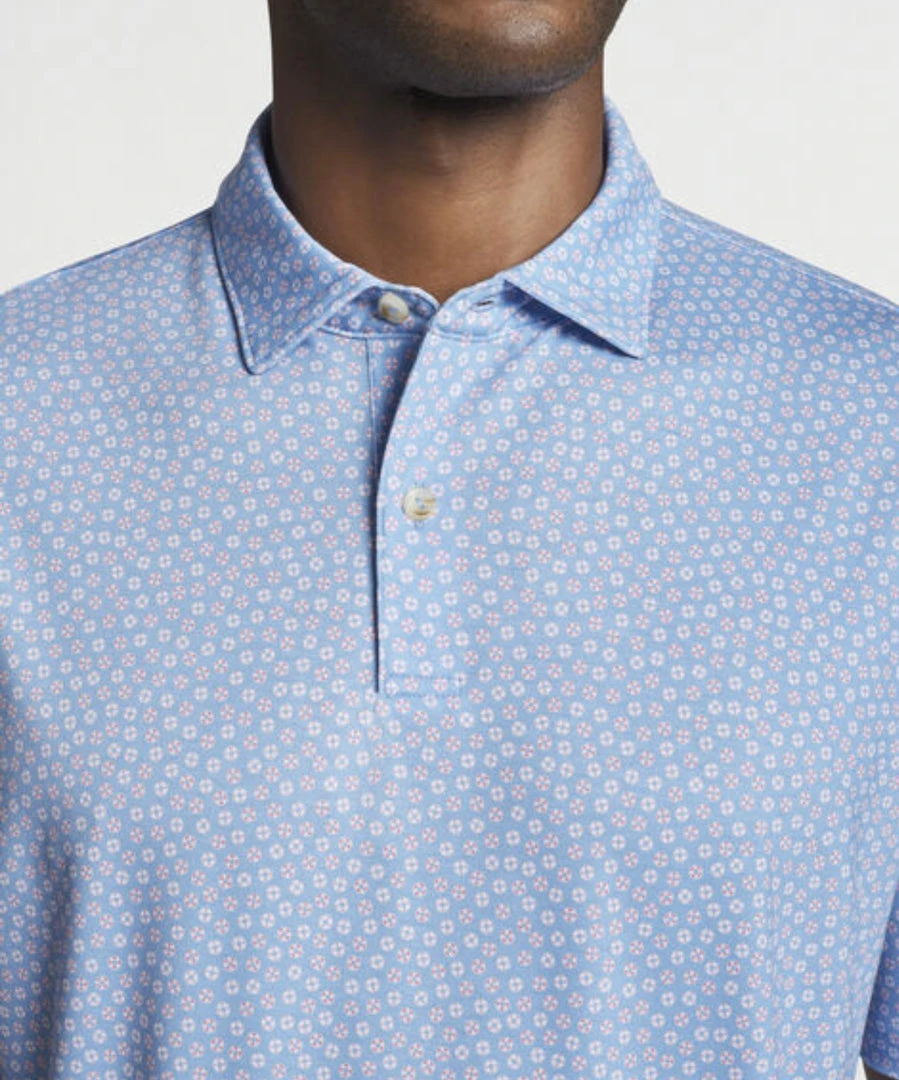 Our drirelease® Natural Touch polos are crafted from a unique performance fabric that provides the breathability, softness and lightweight feel of cotton. This fabric offers four-way stretch, and moisture-wicking keeps you dry and comfortable. This style features a custom print hand-designed in our Pilot Mill creative studio and a hybrid length that allows for tucked and untucked wear. Finished with a self collar and two-button placket.