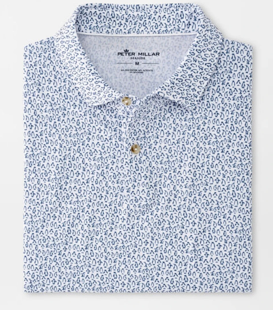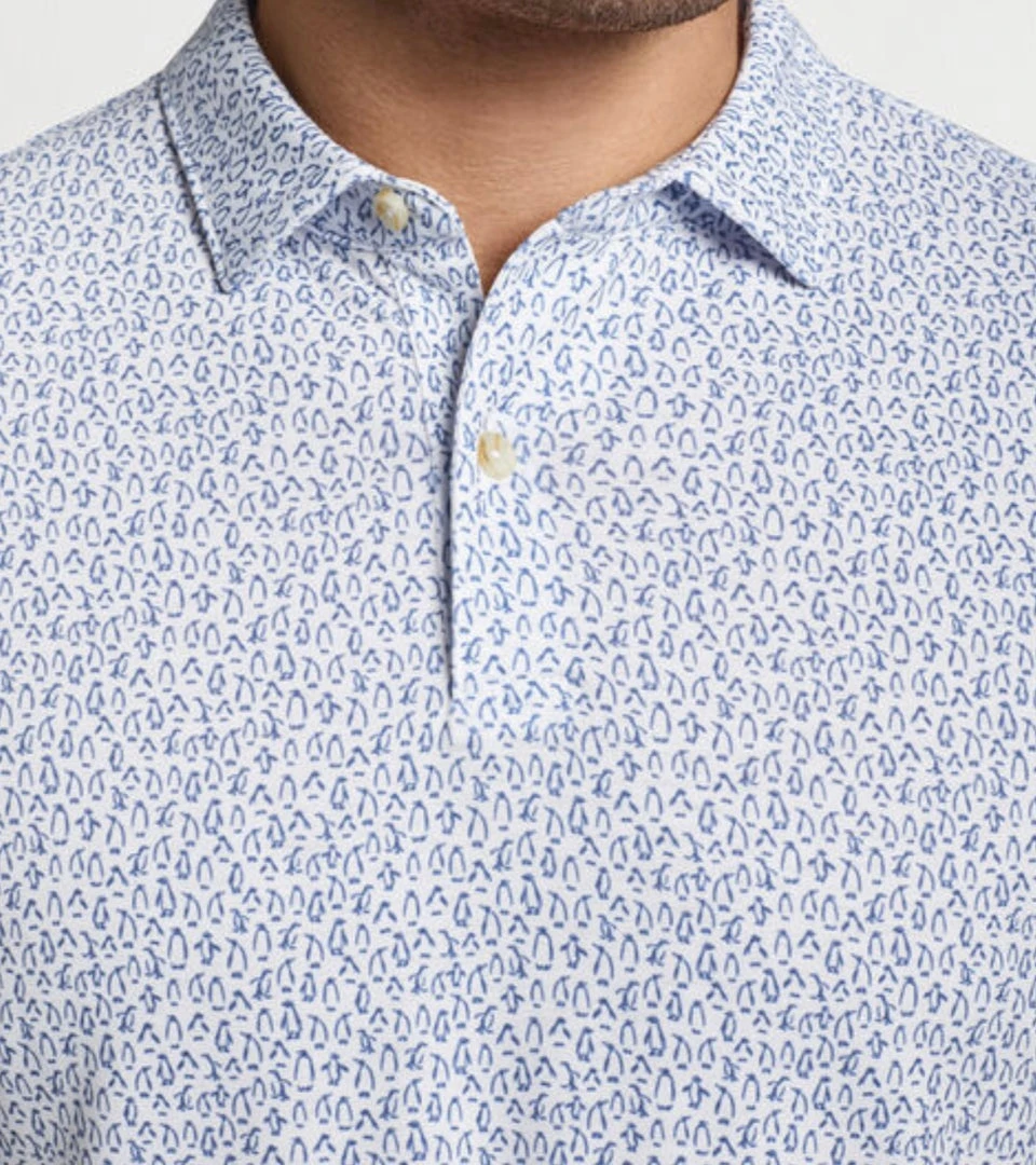 Our drirelease® Natural Touch polos are crafted from a unique performance fabric that provides the breathability, softness and lightweight feel of cotton. This fabric offers four-way stretch, and moisture-wicking keeps you dry and comfortable. This style features a custom penguin print hand-designed in our Pilot Mill creative studio and a hybrid length that allows for tucked and untucked wear. Finished with a self collar and two-button placket.