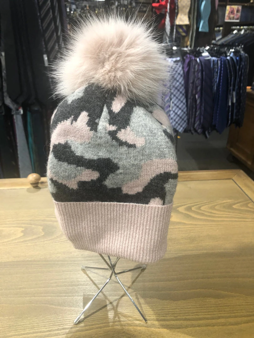 Camo glamour! Camouflage wool beanie hat with genuine fox fur pom.