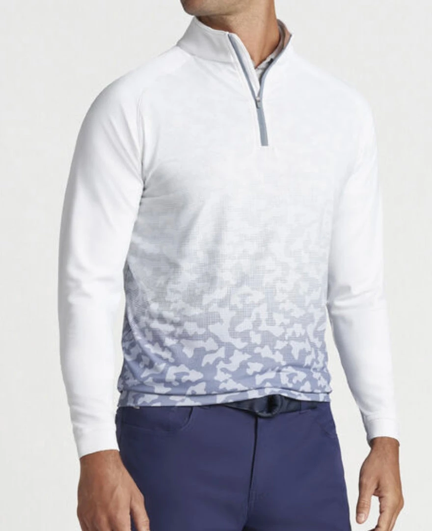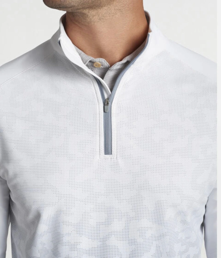 This iconic quarter-zip delivers a performance-focused twist on a classic style. It offers four-way stretch, moisture-wicking and easy-care benefits to keep you comfortable far beyond the final green. The fabric incorporates mélange yarns for subtle visual contrast. It’s finished with a mock collar and banded cuffs and hem. Layer over Peter Millar polos for a sharp look on and off the course.