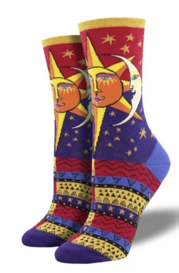 One of the more colorful takes on this classic sun and moon artwork, Laurel Burch has flawlessly added her own flair to the piece and made it her own morphing it into a fun, wearable, piece of art.