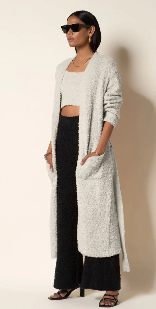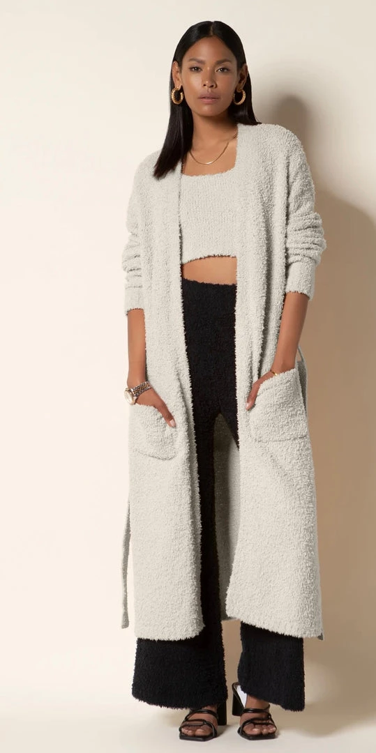 Your new go-to weekend piece? The long, snuggly Lelia Cardigan. Patch front pockets. Side slits.