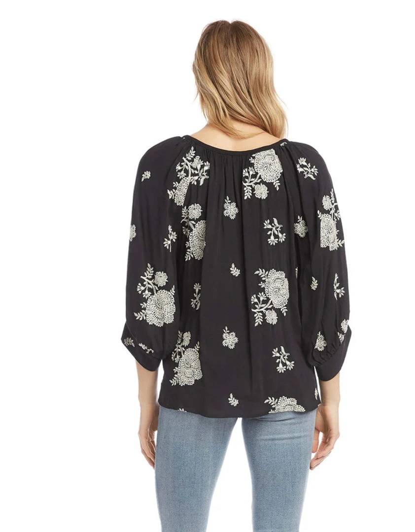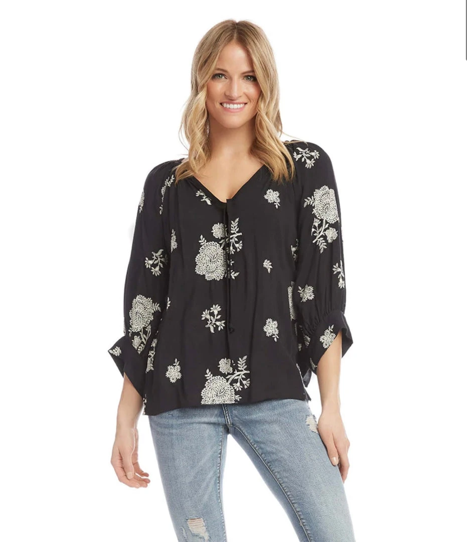 Set an all-around romantic tone with this breezy top covered in embroidered florals. Billowy blouson sleeves and a split neck with ties enhances the charm.