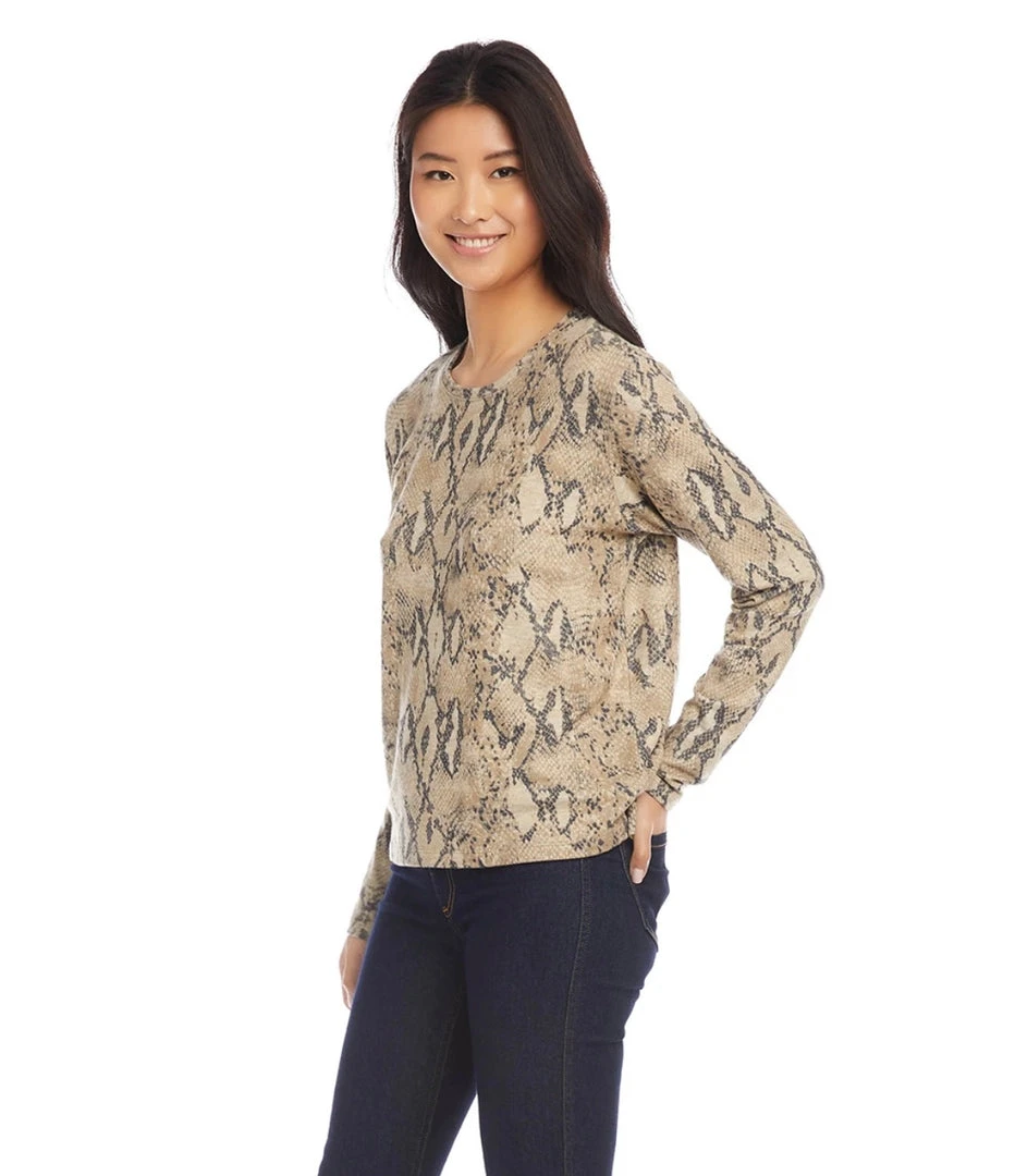- A statement-making snake print defines this top cut in super soft knit. This top can easily transition from desk to dinner with a simple switch of shoes and accessories.