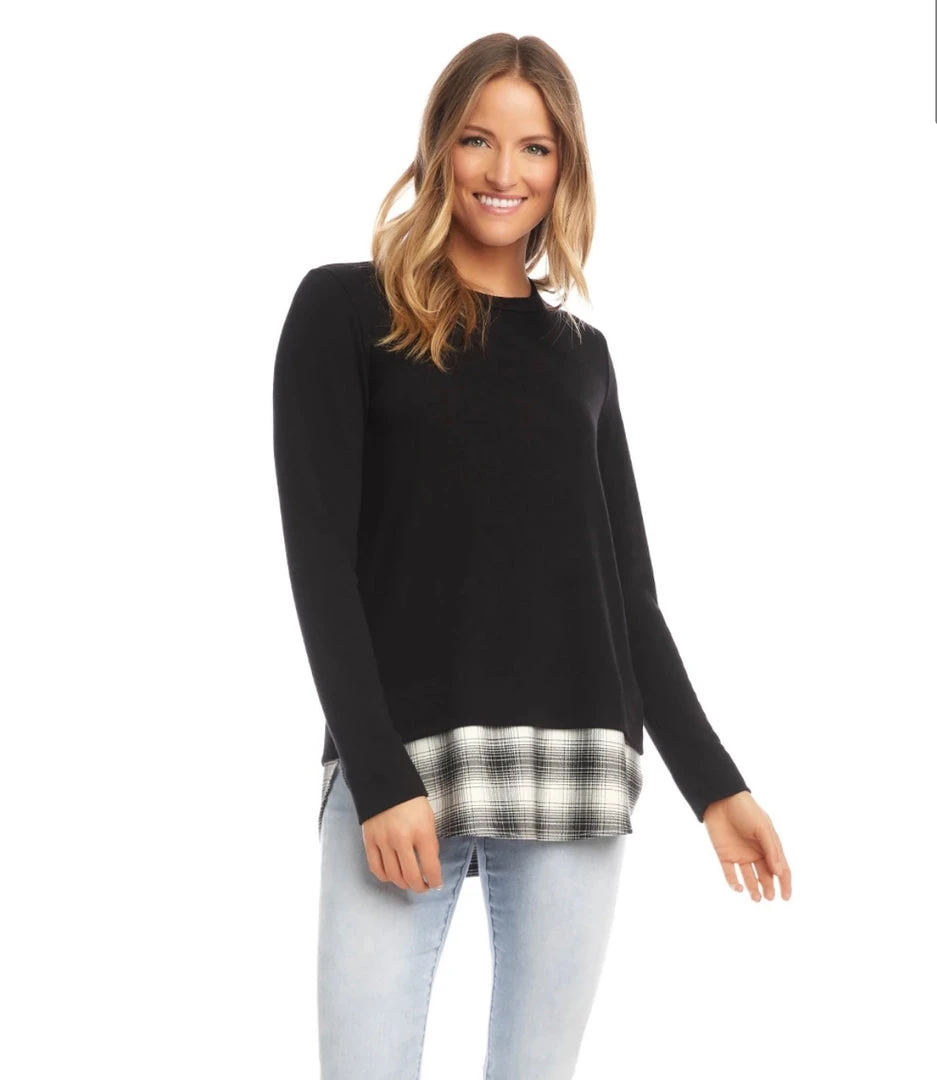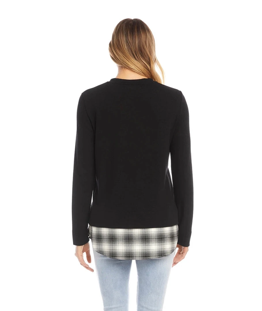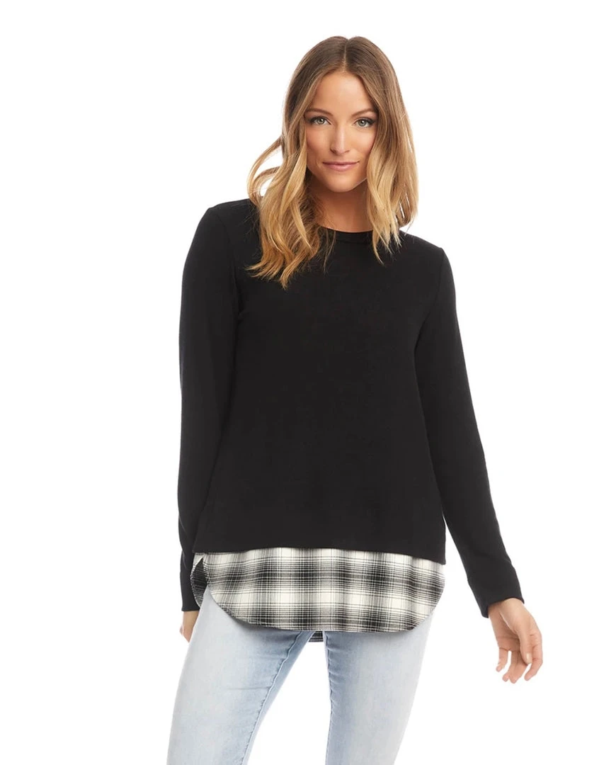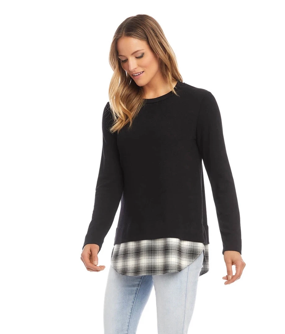 - The ultimate sweater: wear it dressed-up or-down any day of the week. A peek of a plaid shirt at hem give the illusion that this one-piece topper may actually be two.